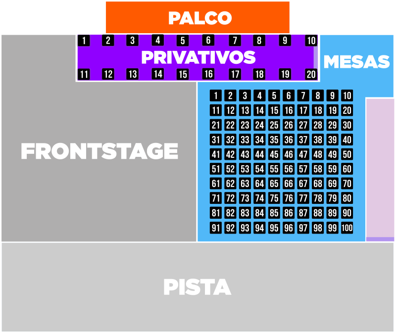• Bistrôs (4 pessoas): Mesas localizadas em frente ao palco, com assentos reservados.