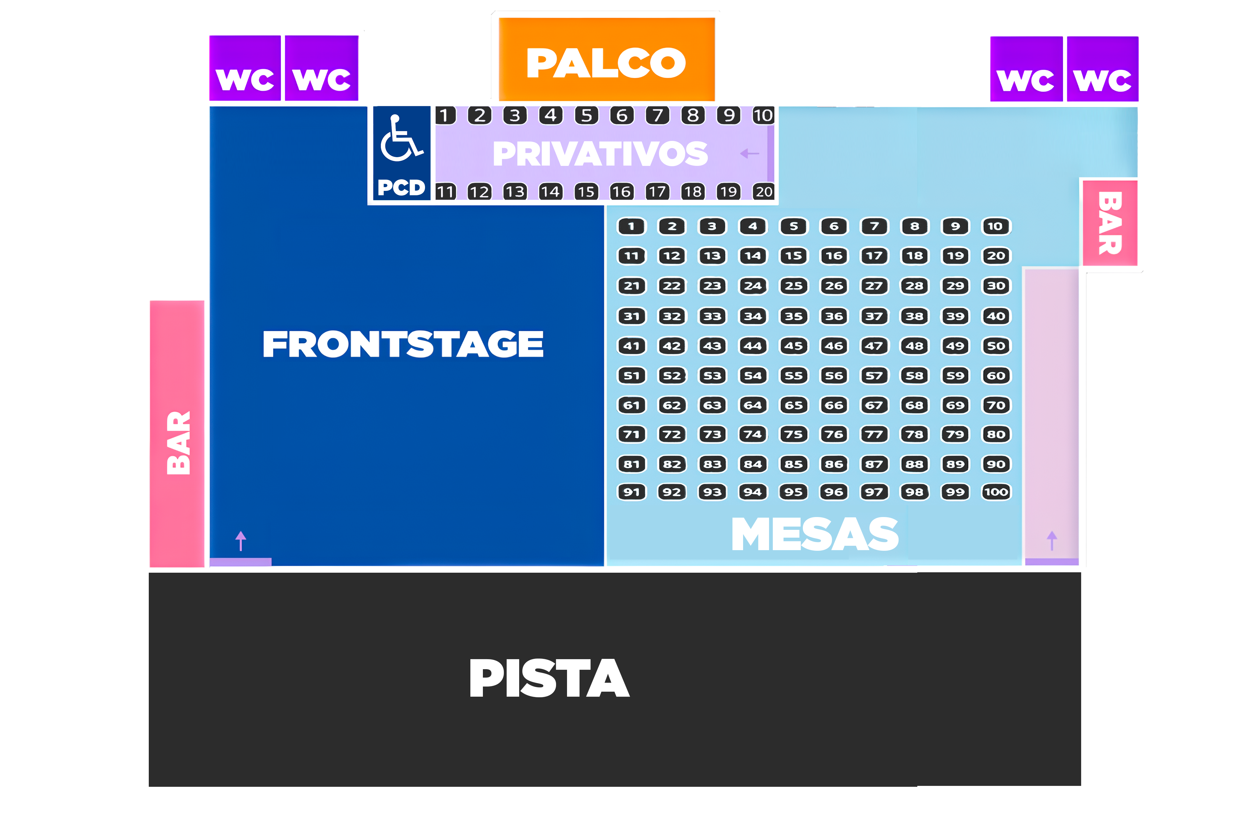 Área privilegiada em frente ao palco, proporcionando maior proximidade com os artistas e uma experiência intensa do show. Bares e Banheiros exclusivos.